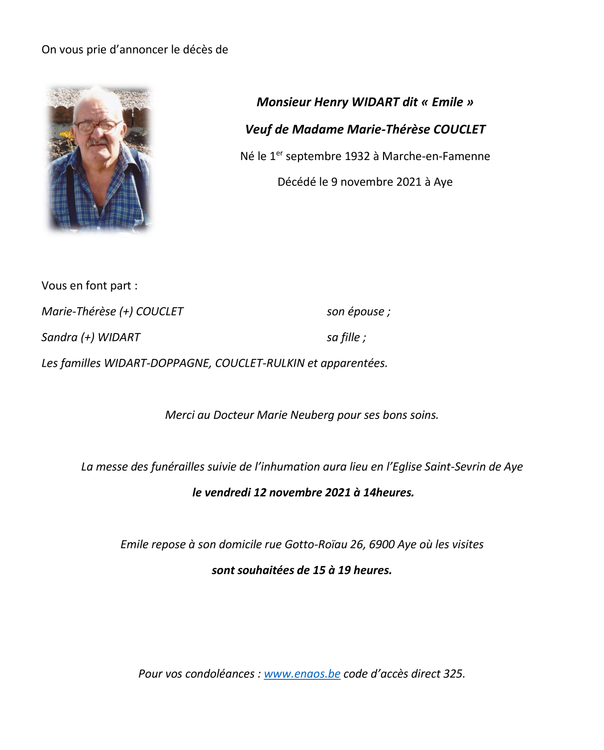 Fallecido en Aye (6900) el martes, 9 de noviembre de 2021 a la edad de 89 años