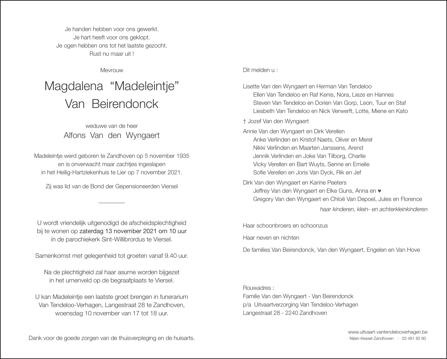 Décédée à Lier (2500) le dimanche 7 novembre 2021 à l'âge de 86 ans