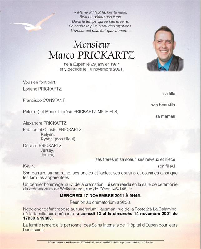 Décédé à Eupen (4700) le mercredi 10 novembre 2021 à l'âge de 44 ans