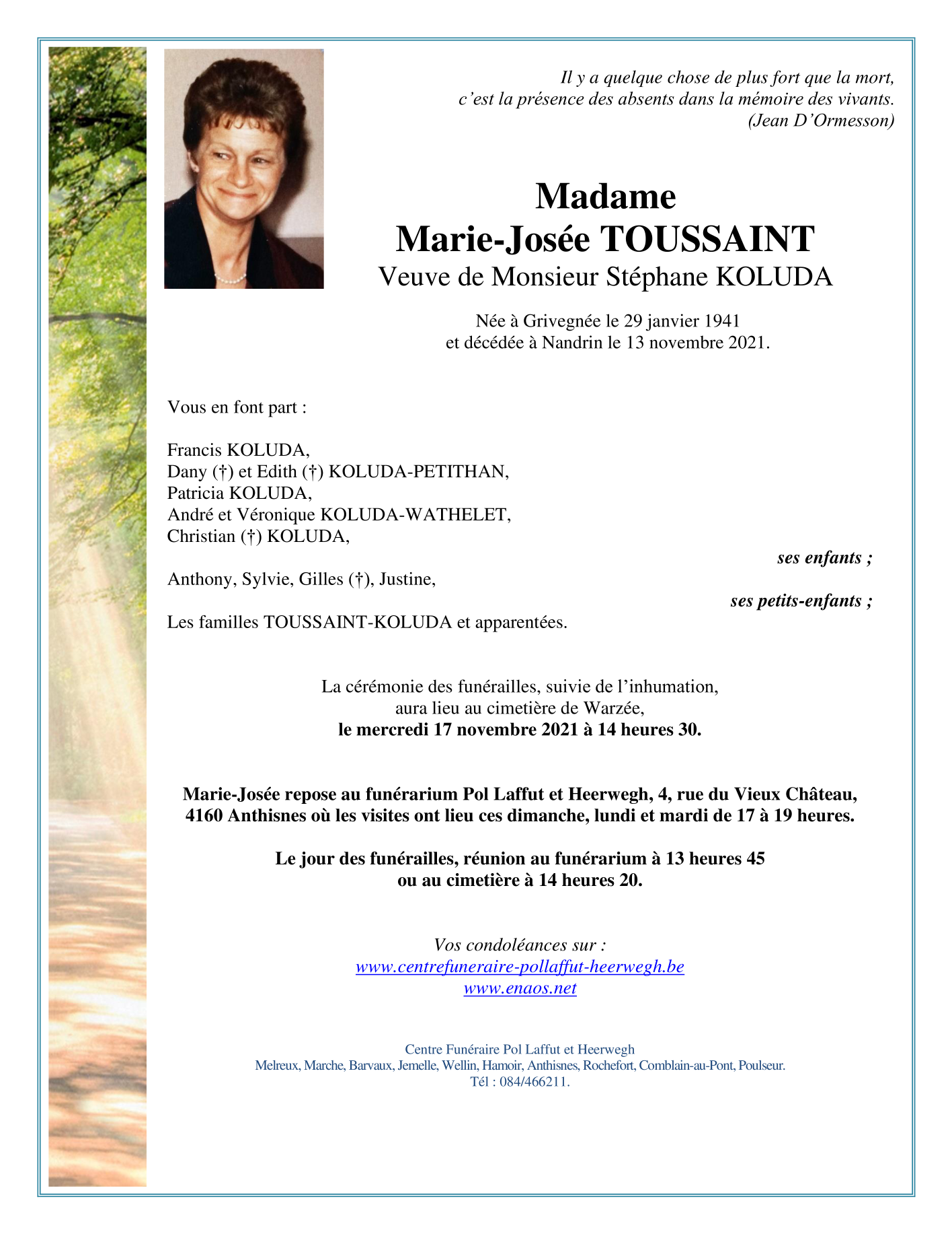 Décédée à Nandrin (4550) le samedi 13 novembre 2021 à l'âge de 80 ans