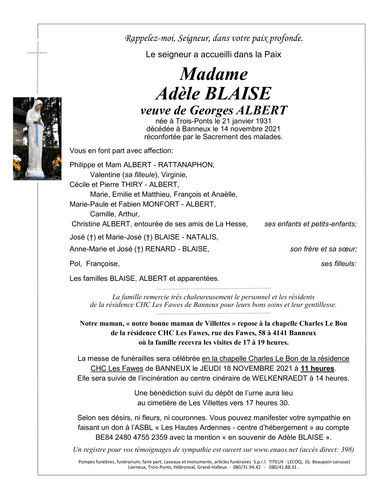 Décédée à Banneux (4141) le dimanche 14 novembre 2021 à l'âge de 90 ans