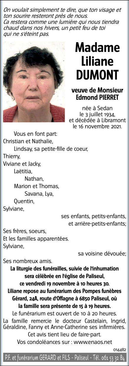 Décédée à Libramont (6800) le mardi 16 novembre 2021 à l'âge de 87 ans