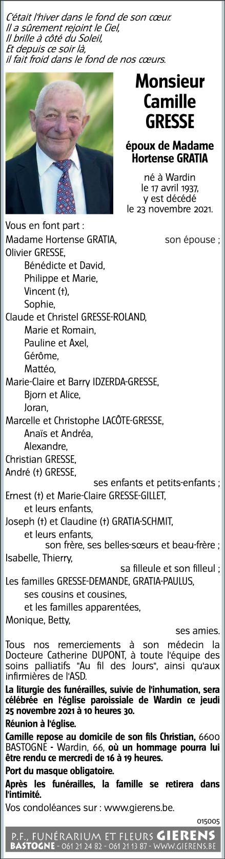 Décédé à Bastogne (6600) le mardi 23 novembre 2021 à l'âge de 84 ans