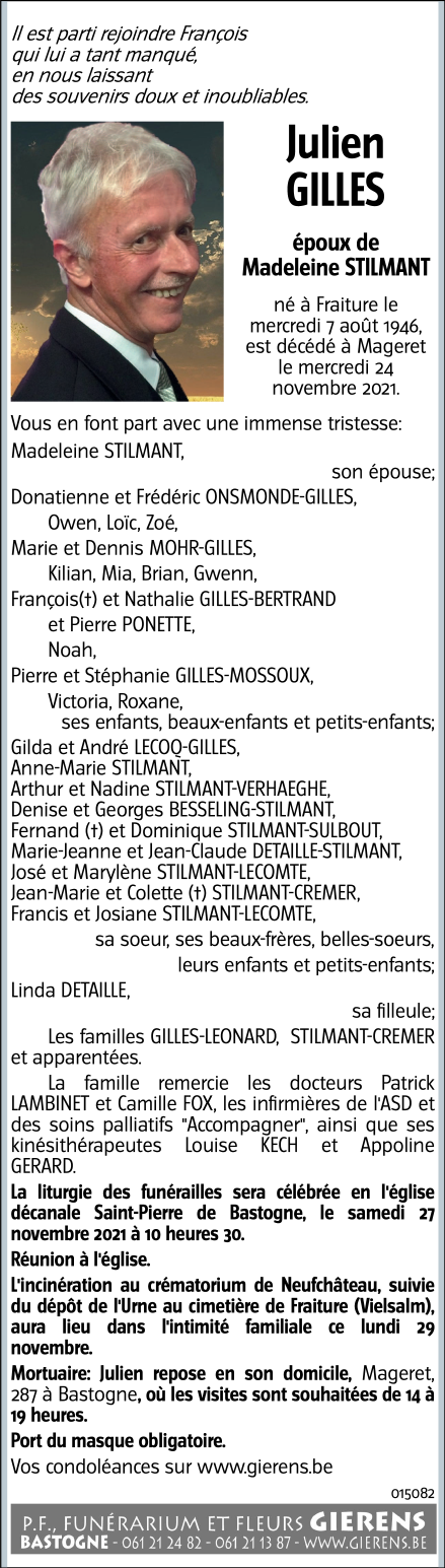 Décédé à Bastogne (6600) le mercredi 24 novembre 2021 à l'âge de 75 ans