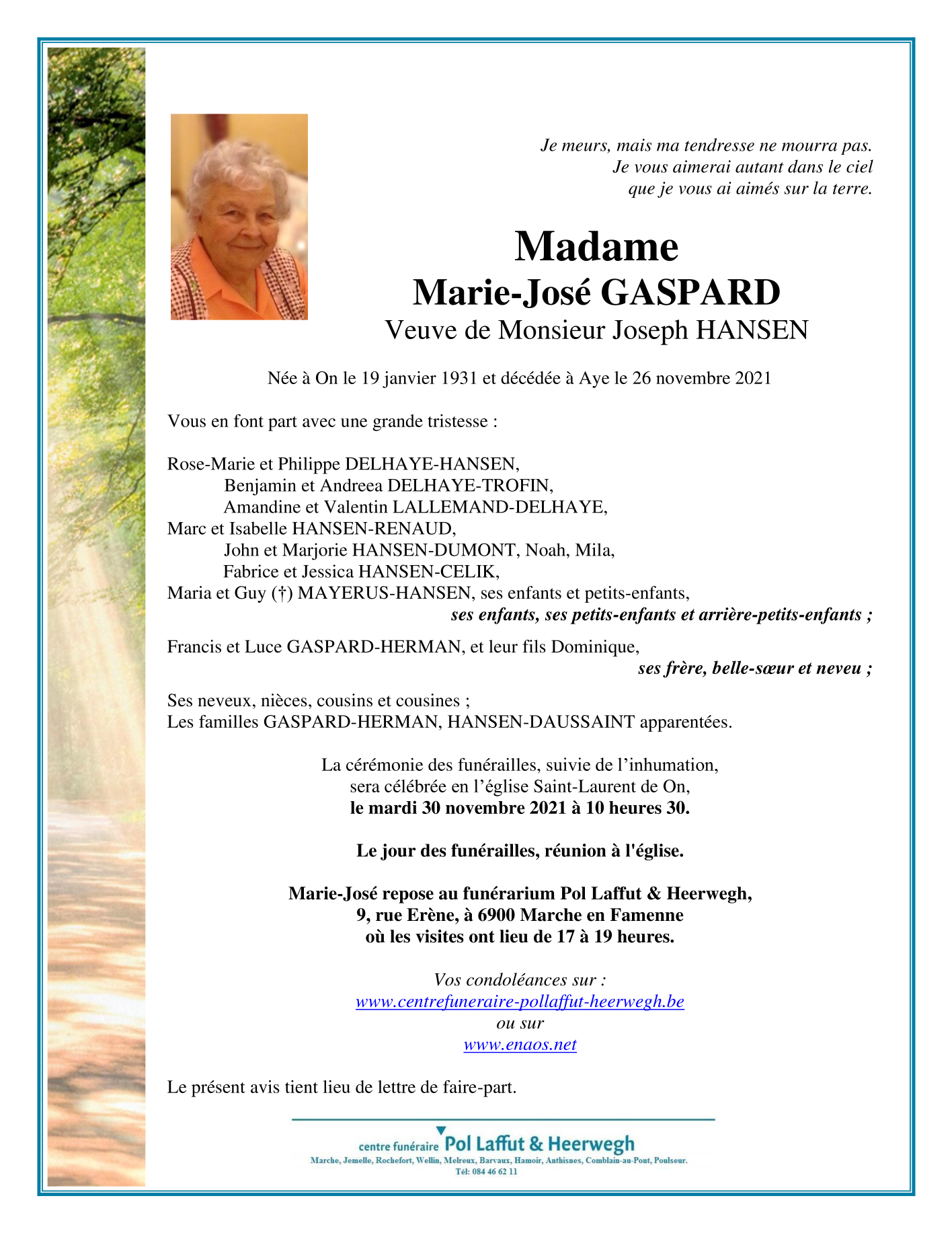 Décédée à Aye (6900) le vendredi 26 novembre 2021 à l'âge de 90 ans