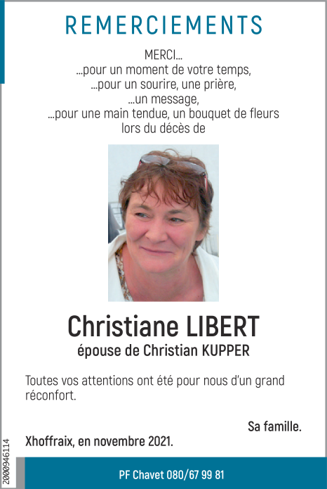 Décédée à Xhoffraix (4960) le samedi 30 octobre 2021 à l'âge de 60 ans