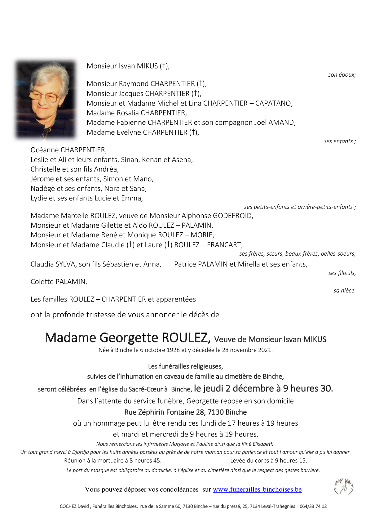 Décédée à Battignies (7130) le dimanche 28 novembre 2021 à l'âge de 93 ans