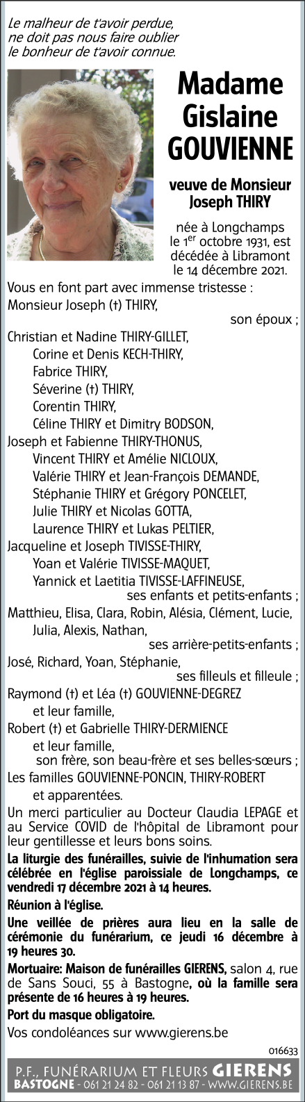 Décédée à Libramont-Chevigny (6800) le mardi 14 décembre 2021 à l'âge de 90 ans