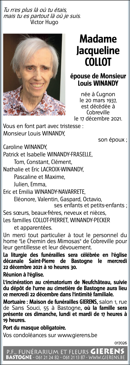 Décédée à Vaux-sur-Sure (6640) le vendredi 17 décembre 2021 à l'âge de 84 ans