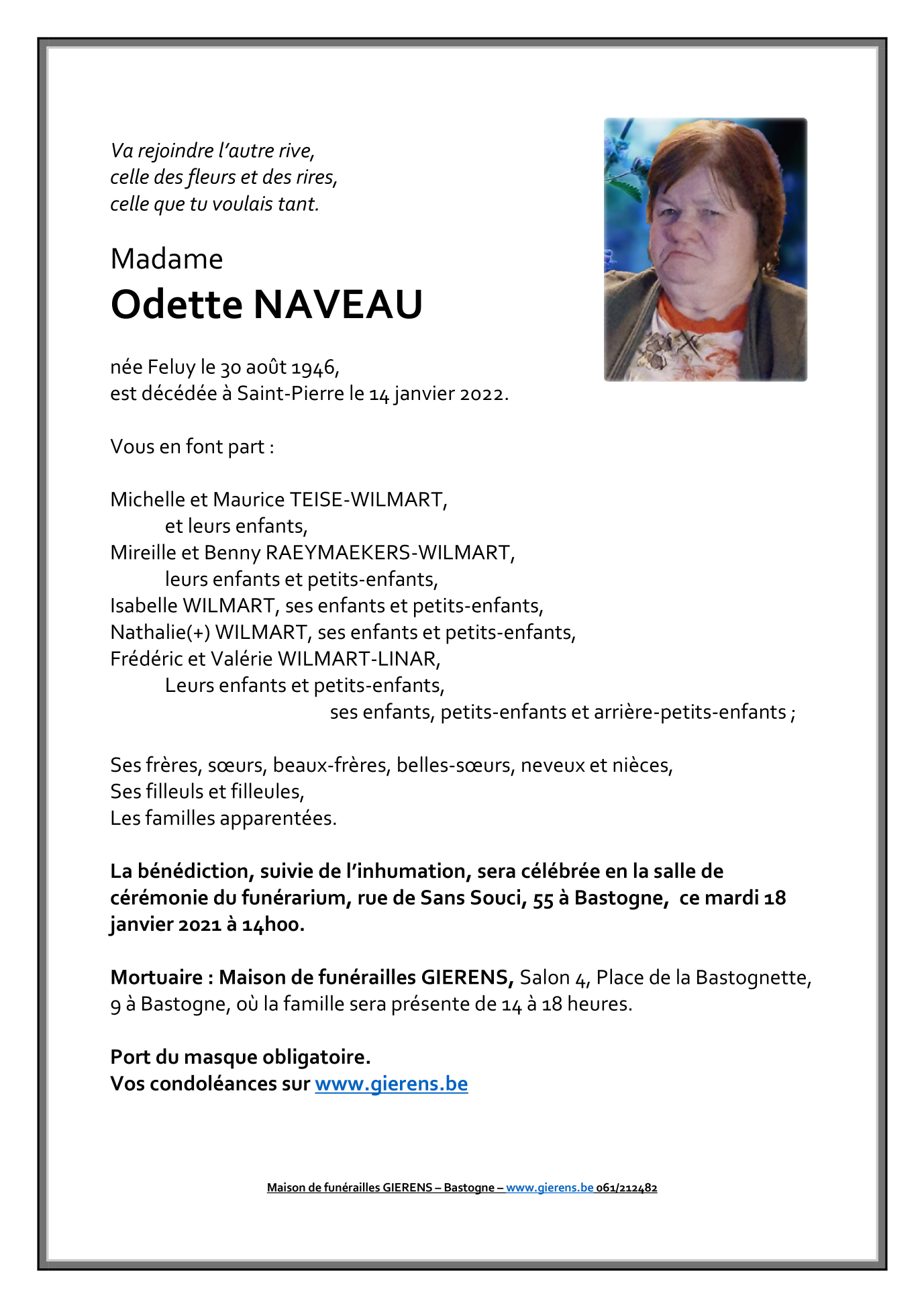 Décédée à Libramont-Chevigny (6800) le vendredi 14 janvier 2022 à l'âge de 75 ans