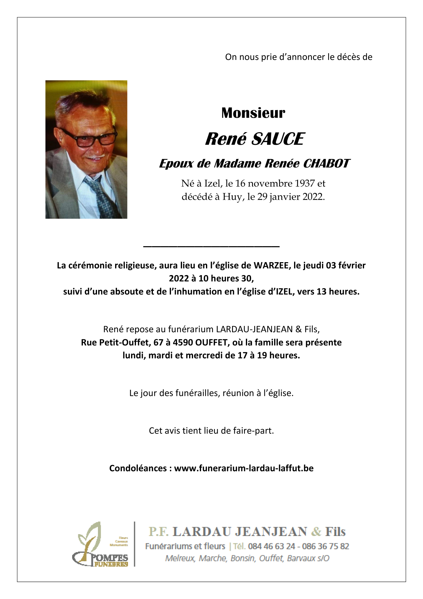 Décédé à Huy (4500) le samedi 29 janvier 2022 à l'âge de 84 ans