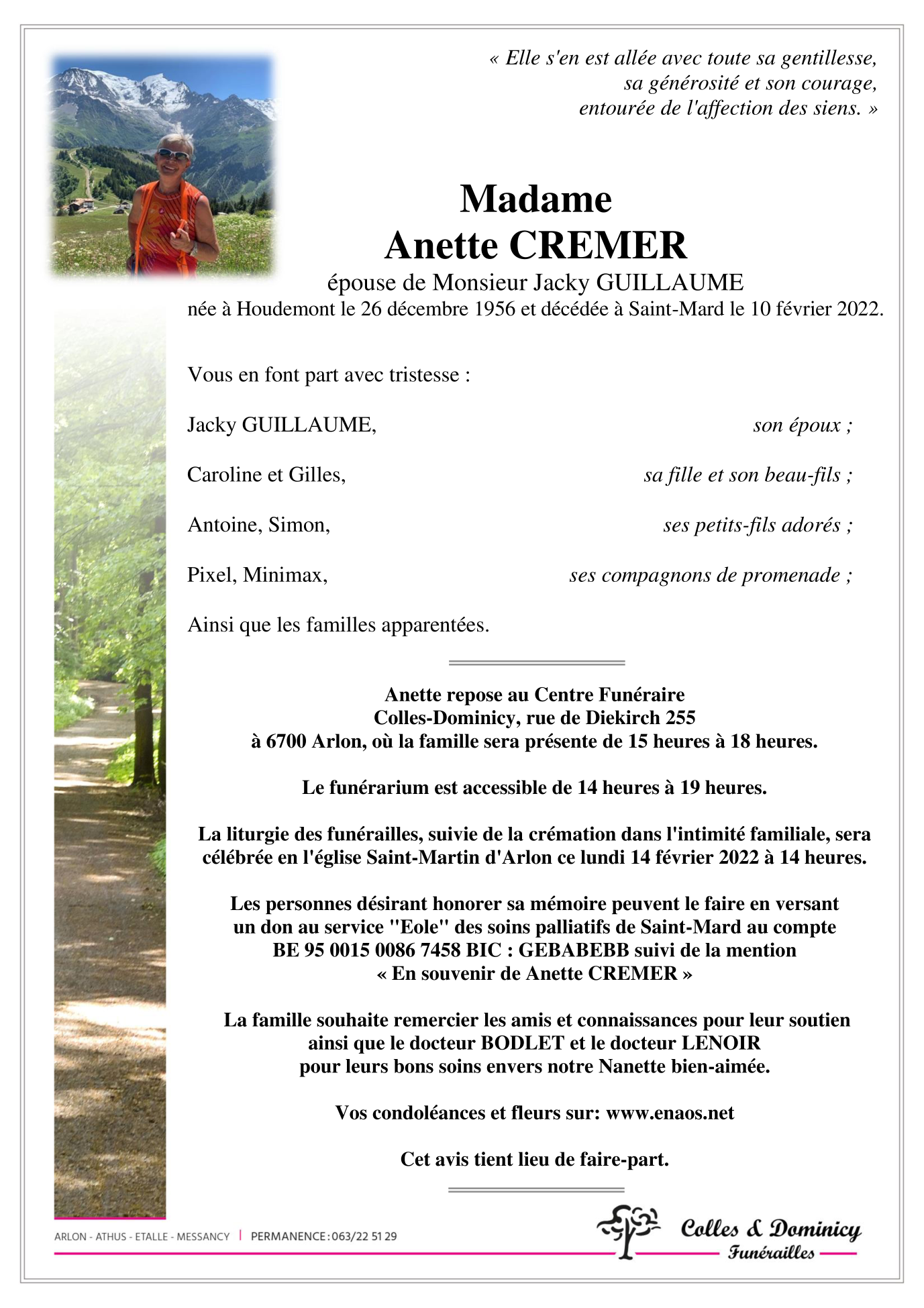 Died in Saint-Mard (6762) on 10 February 2022 at the age of 65 years