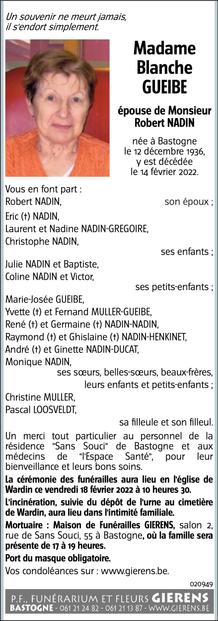 Décédée à Bastogne (6600) le lundi 14 février 2022 à l'âge de 85 ans