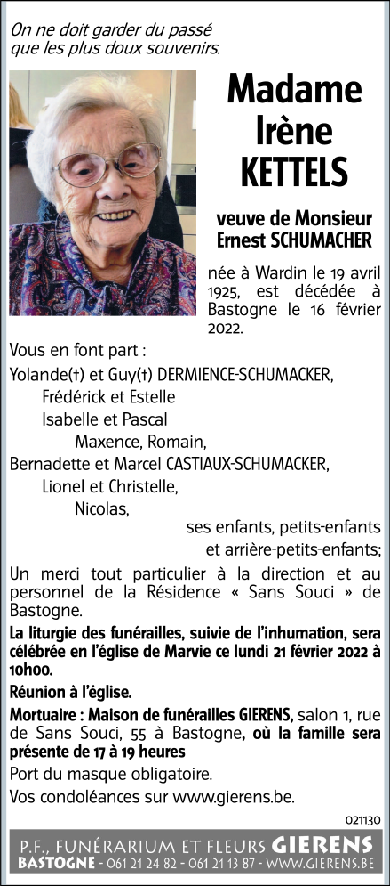 Décédée à Bastogne (6600) le mercredi 16 février 2022 à l'âge de 96 ans