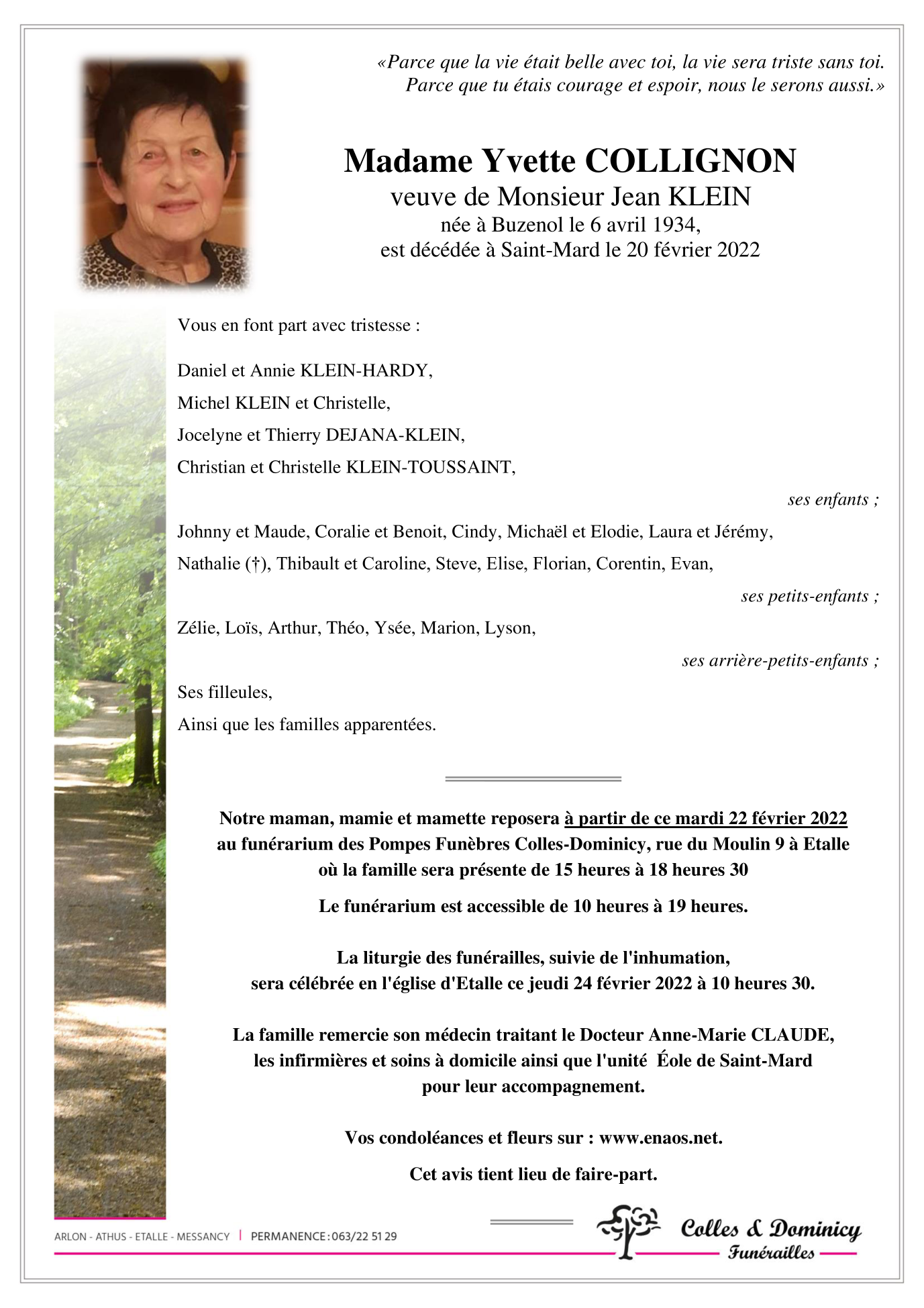 Widow of Monsieur Jean KLEIN