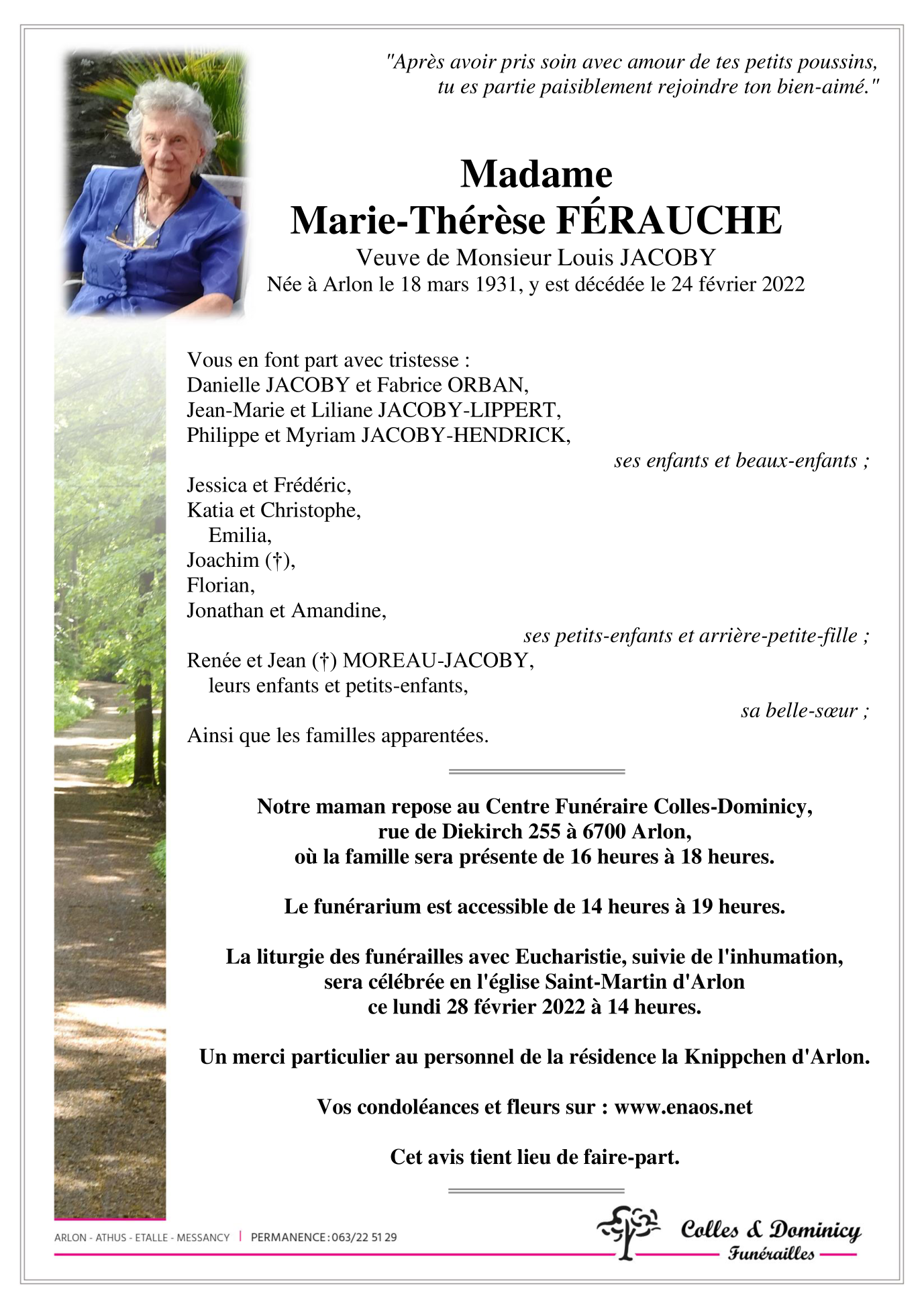 Fallecida en Arlon (6700) el jueves, 24 de febrero de 2022 a la edad de 90 años