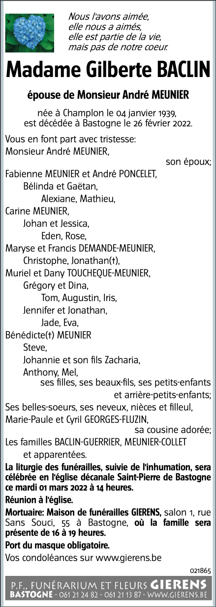 Décédée à Bastogne (6600) le samedi 26 février 2022 à l'âge de 83 ans