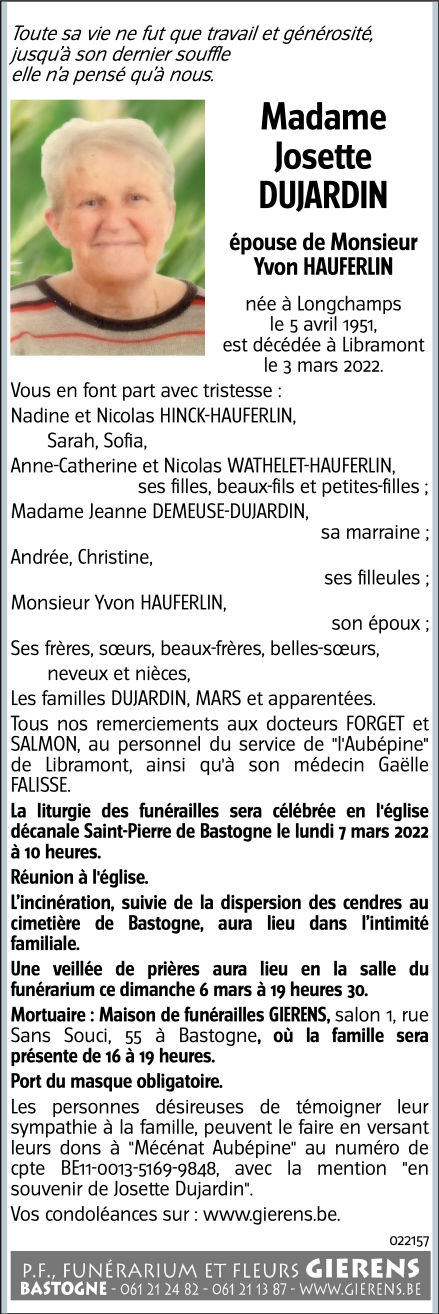 Décédée à Libramont-Chevigny (6800) le jeudi 3 mars 2022 à l'âge de 70 ans