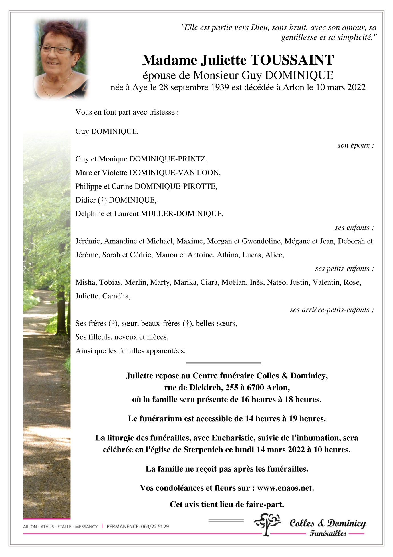 Fallecida en Arlon (6700) el jueves, 10 de marzo de 2022 a la edad de 82 años