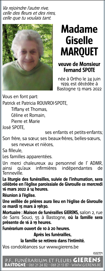 Fallecida en Bastogne (6600) el domingo, 13 de marzo de 2022 a la edad de 82 años