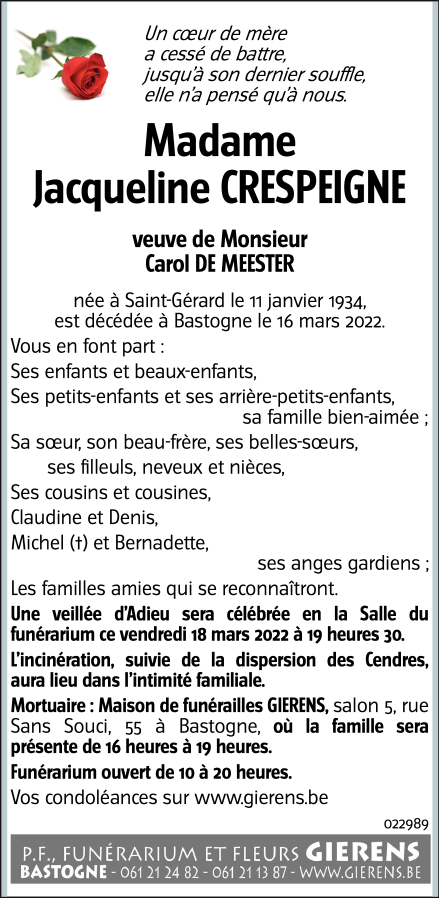 Décédée à Bastogne (6600) le mercredi 16 mars 2022 à l'âge de 88 ans