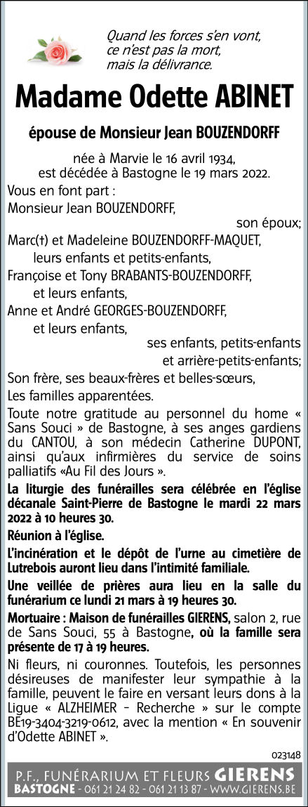 Fallecida en Bastogne (6600) el sábado, 19 de marzo de 2022 a la edad de 87 años