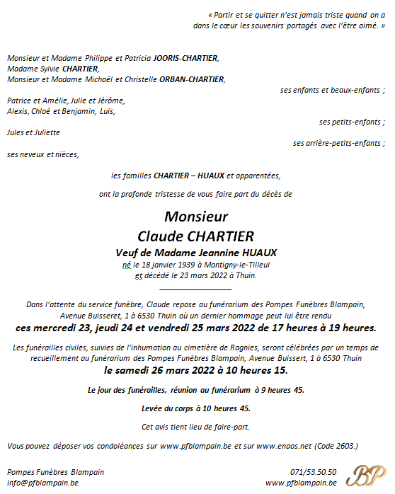 Décédé à Thuin (6530) le mercredi 23 mars 2022 à l'âge de 83 ans