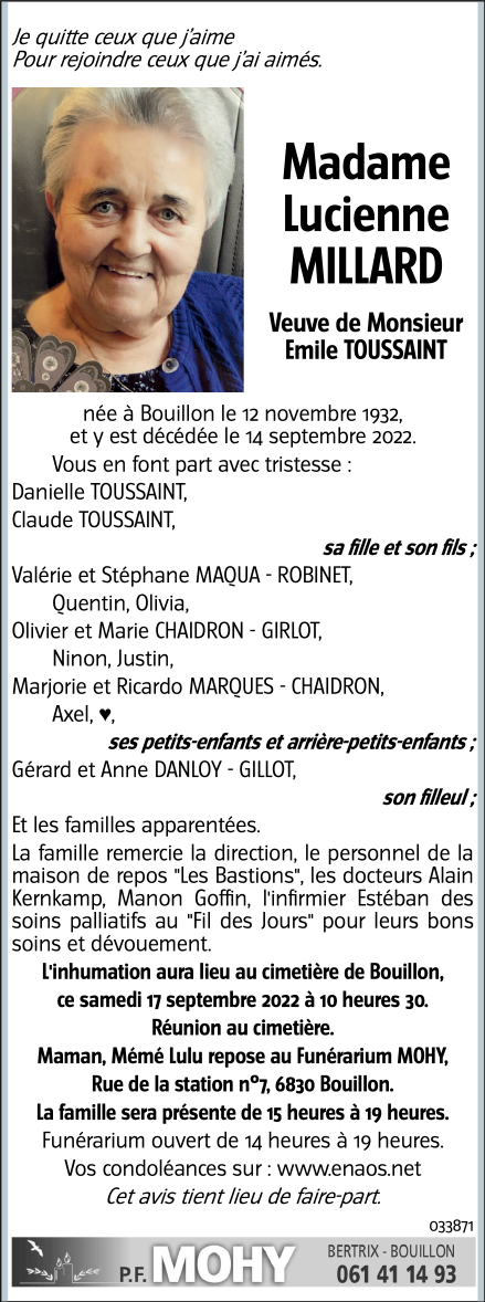 Décédé à Bouillon (6830) le mercredi 14 septembre 2022 à l'âge de 89 ans