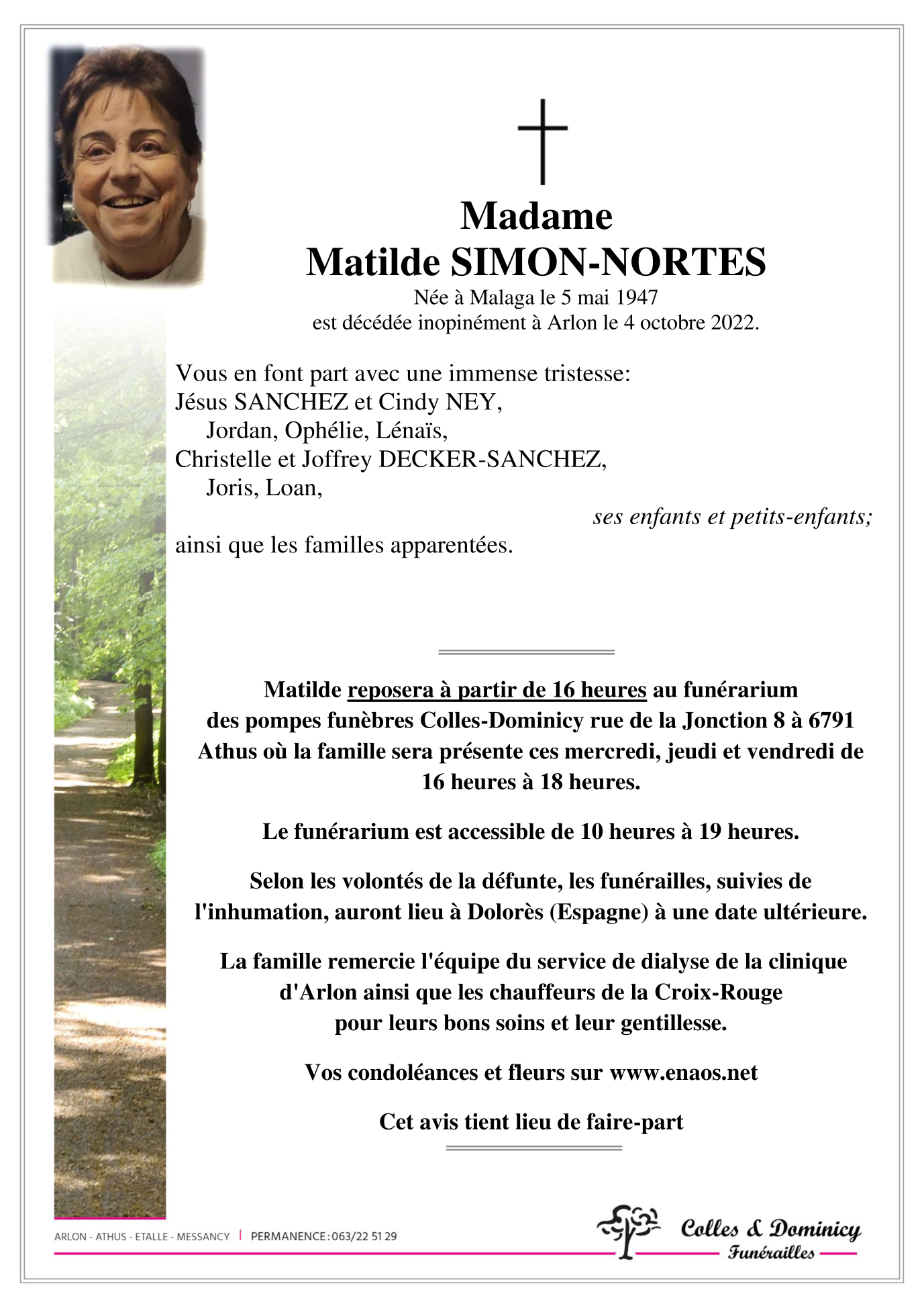 Fallecida en Arlon (6700) el martes, 4 de octubre de 2022 a la edad de 75 años