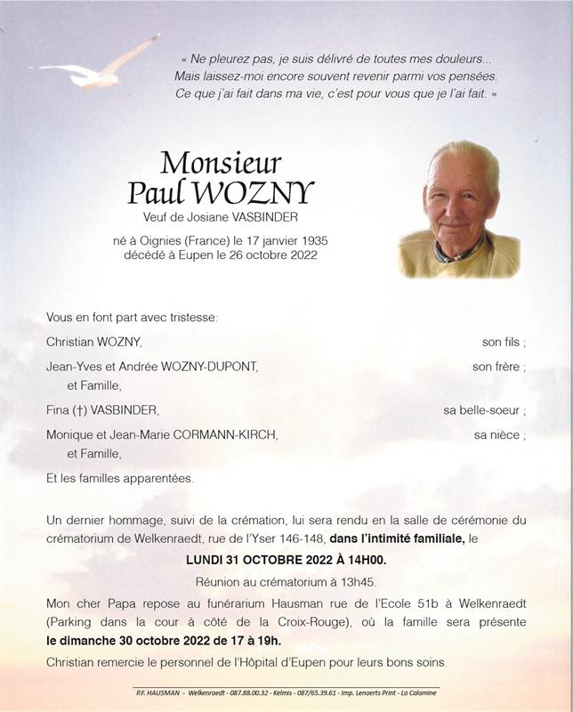 Décédé à Eupen (4700) le mercredi 26 octobre 2022 à l'âge de 87 ans