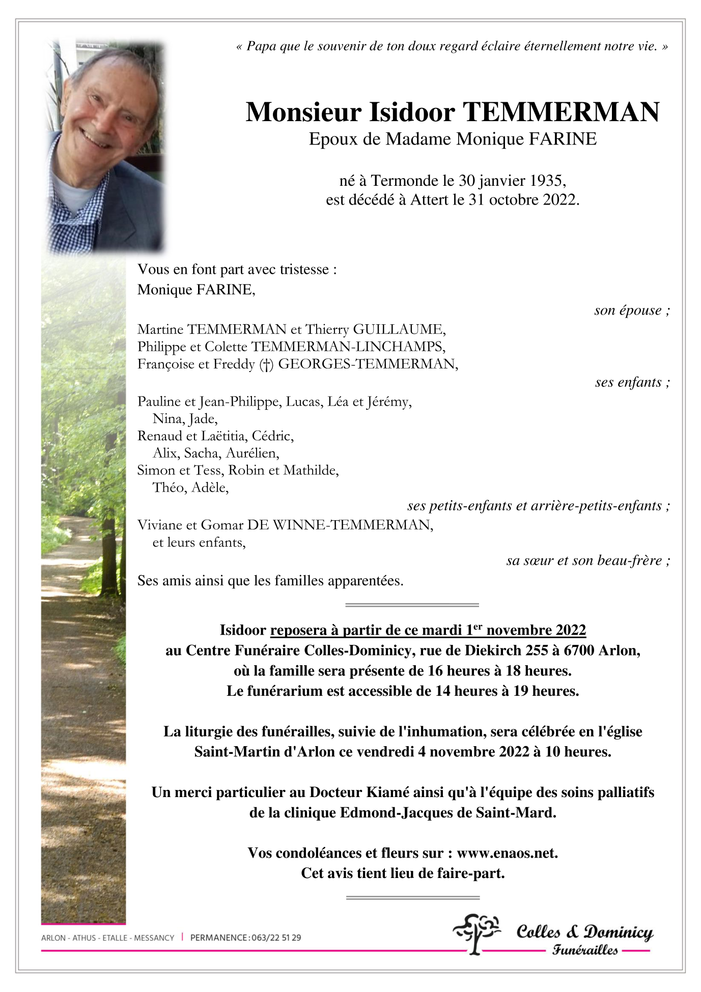 Décédé à Attert (6717) le lundi 31 octobre 2022 à l'âge de 87 ans
