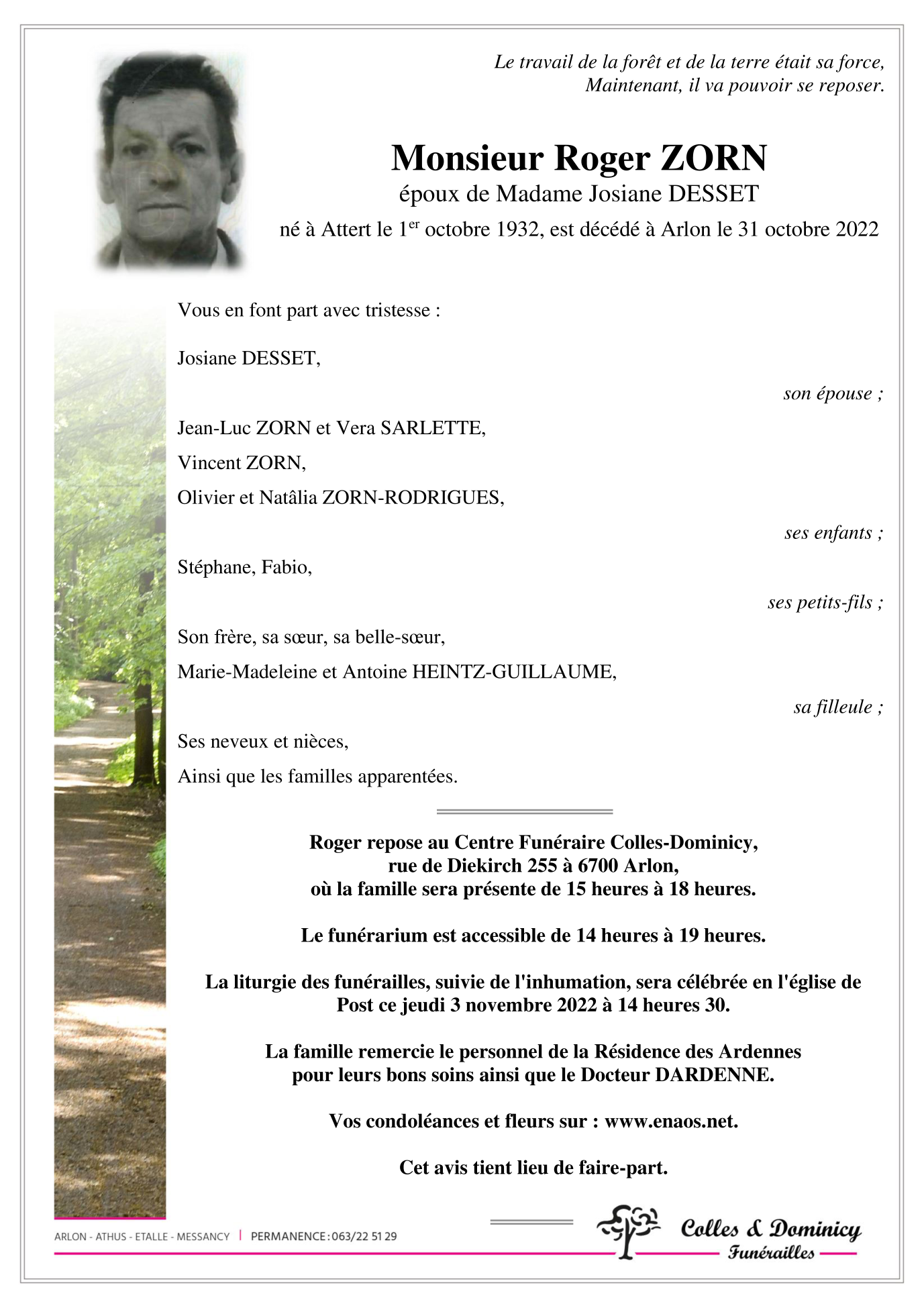 Décédé à Arlon (6700) le lundi 31 octobre 2022 à l'âge de 90 ans