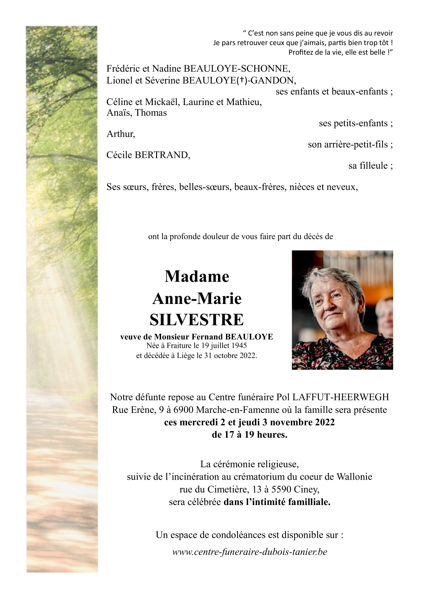 Décédée à Liège (4000) le dimanche 30 octobre 2022 à l'âge de 77 ans