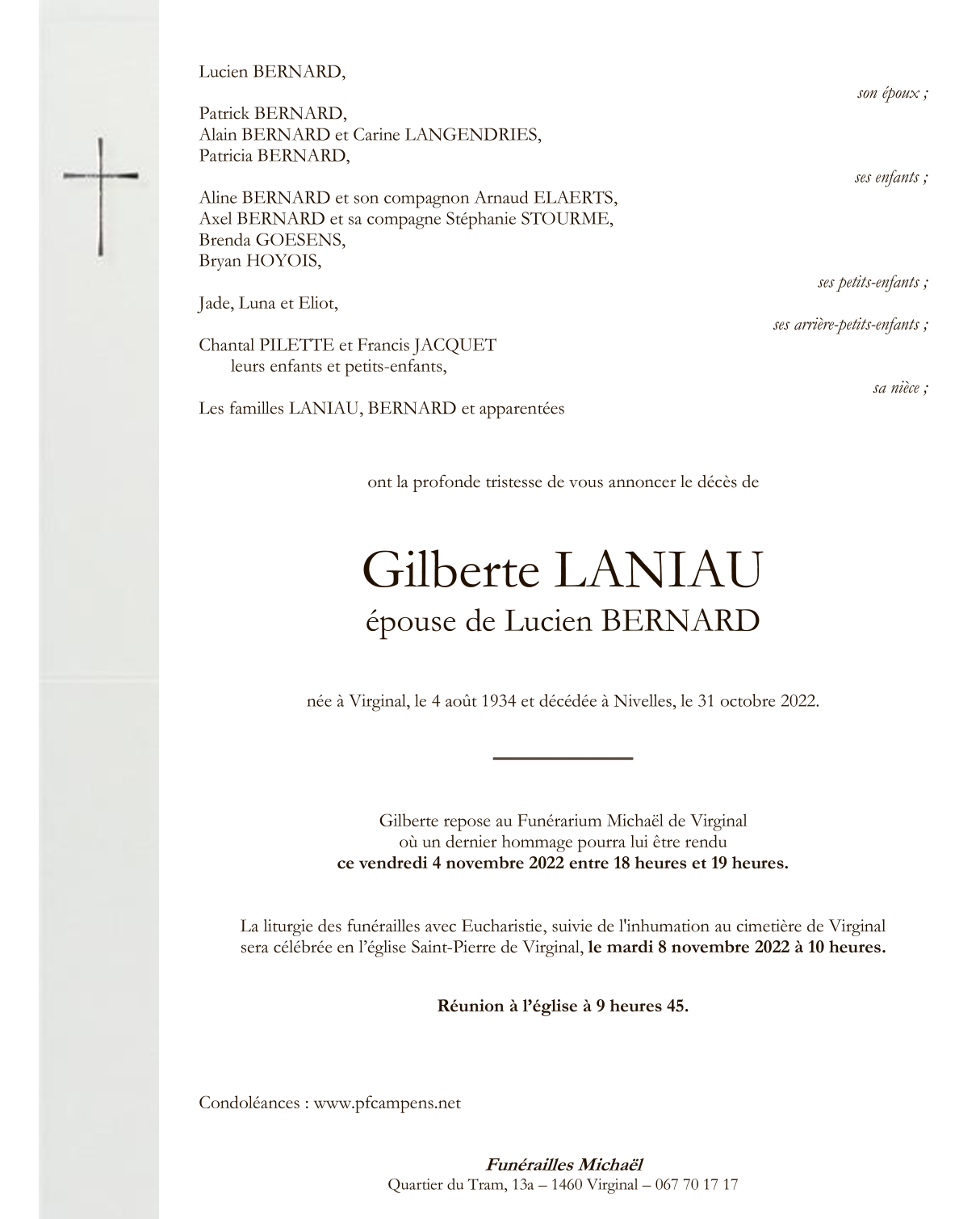 Décédée à Nivelles (1400) le lundi 31 octobre 2022 à l'âge de 88 ans