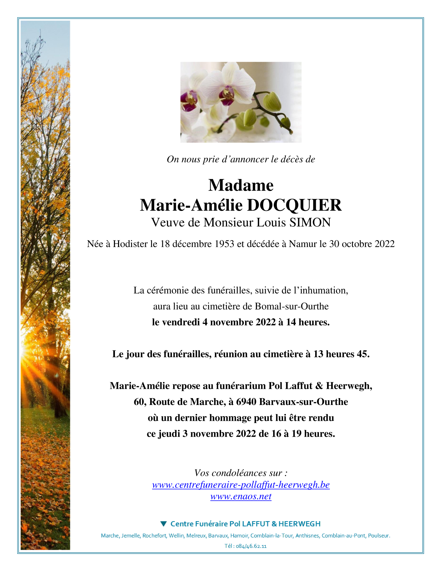 Décédée à Namur (5000) le lundi 31 octobre 2022 à l'âge de 68 ans