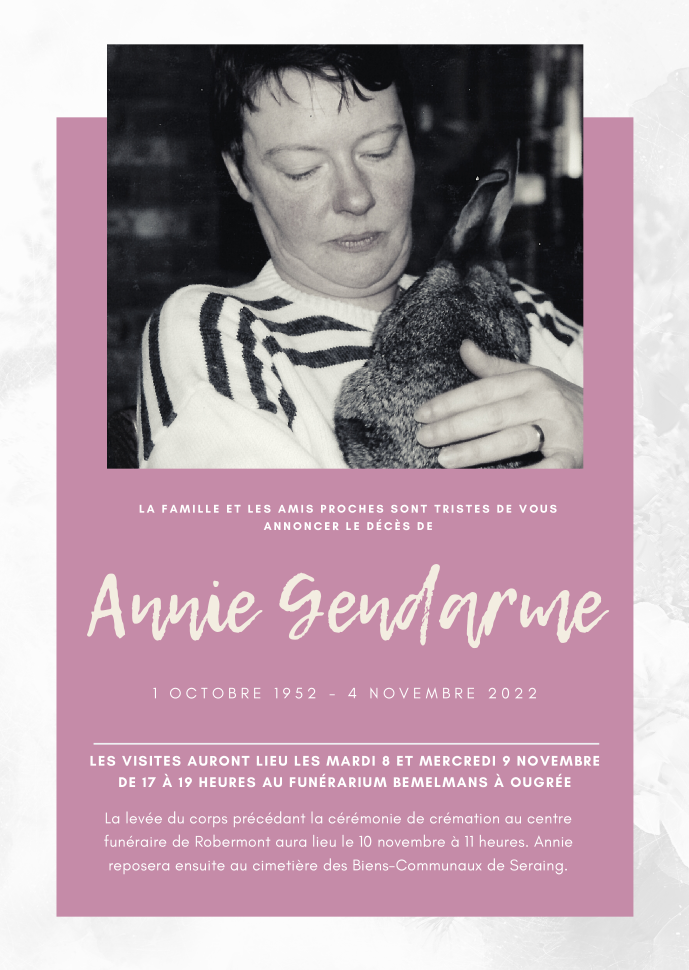 Décédée à Ougrée (4102) le vendredi 4 novembre 2022 à l'âge de 70 ans