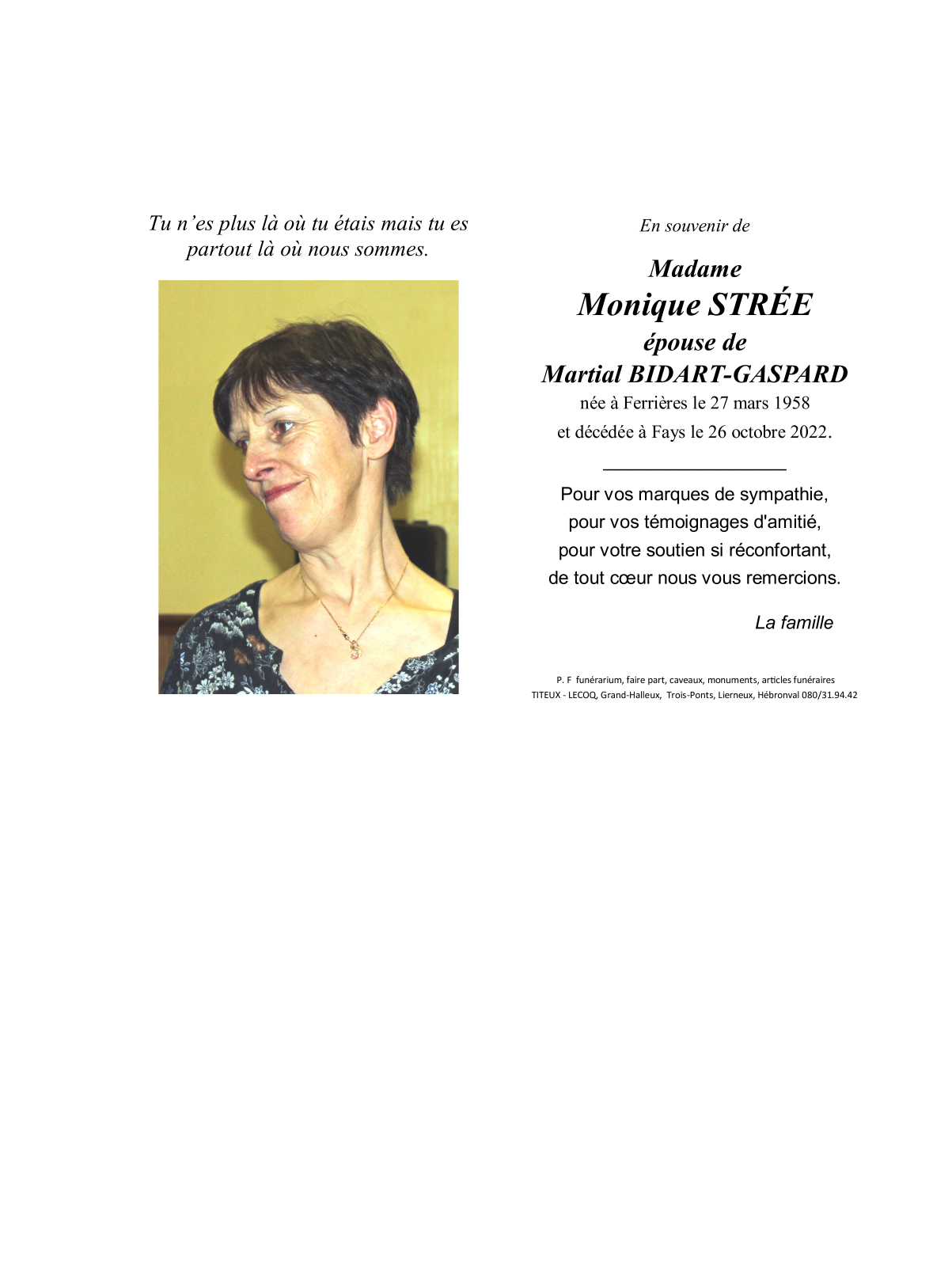 Décédée à Fays (6960) le mercredi 26 octobre 2022 à l'âge de 64 ans