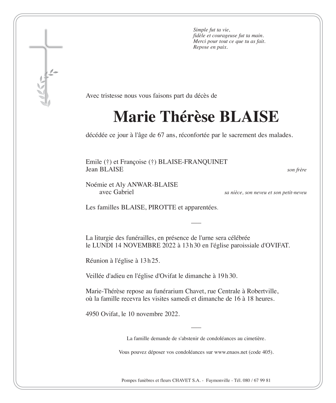 Fallecida en Ovifat (4950) el jueves, 10 de noviembre de 2022 a la edad de 67 años