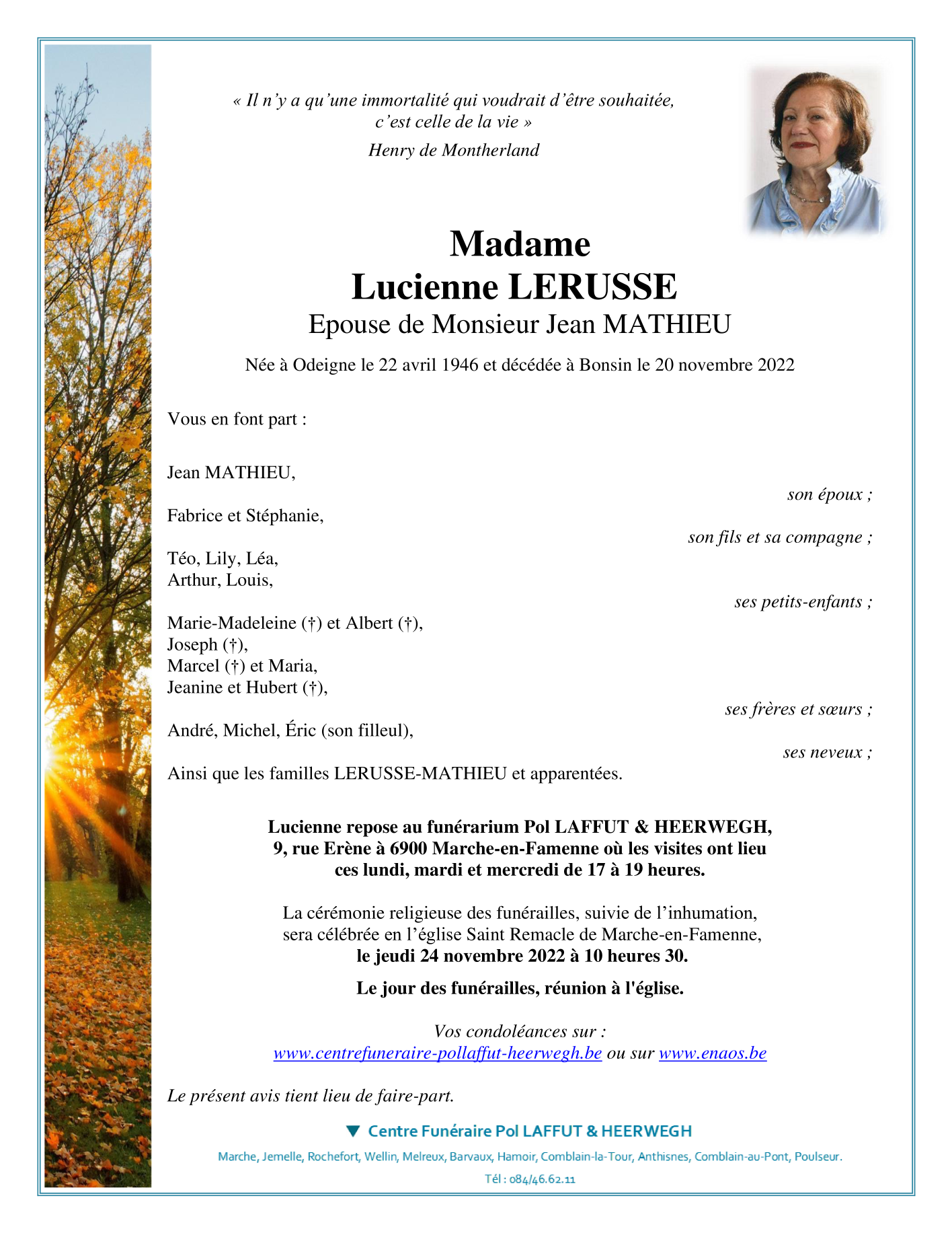 Décédée à Bonsin (5377) le dimanche 20 novembre 2022 à l'âge de 76 ans