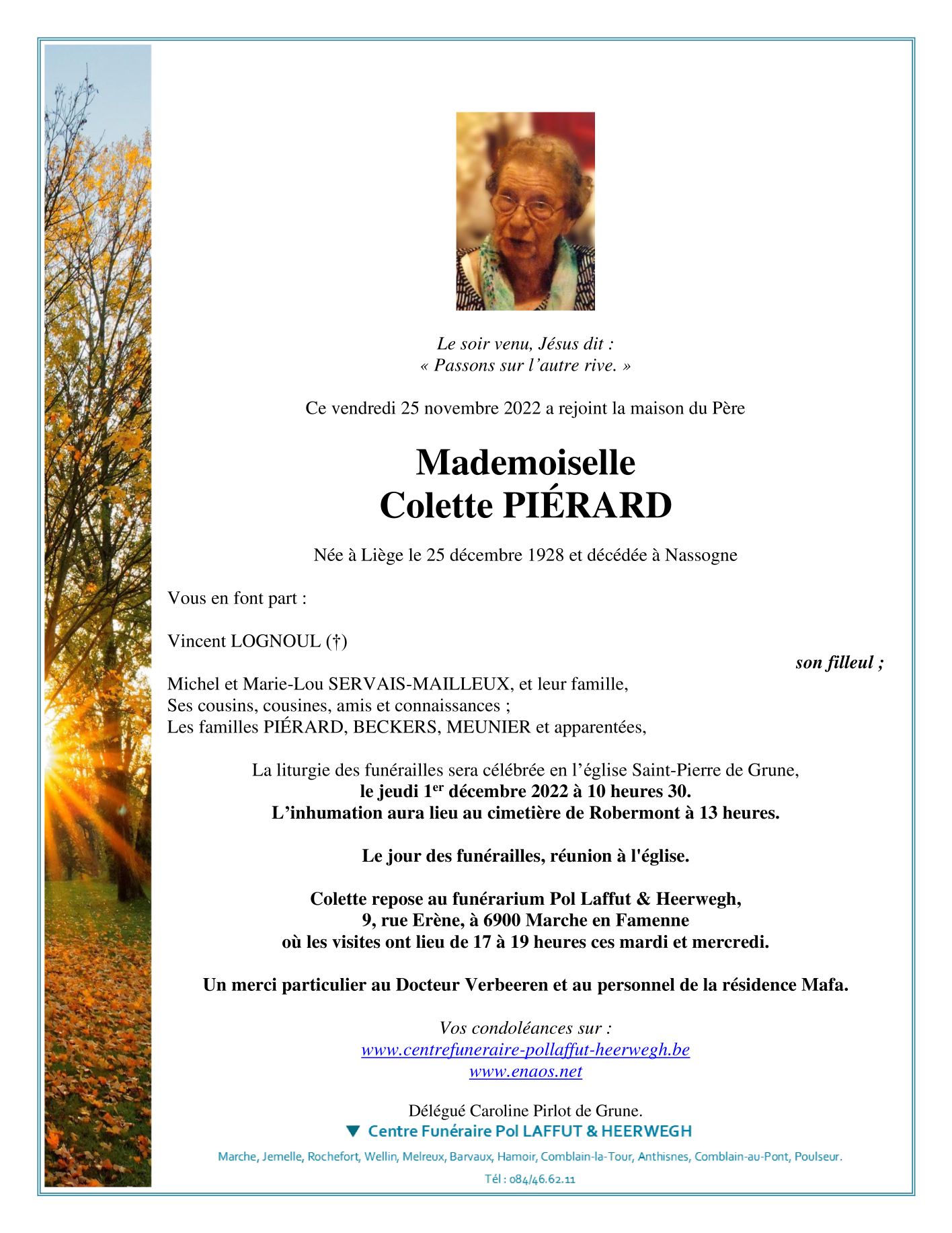 Décédée à Nassogne (6950) le vendredi 25 novembre 2022 à l'âge de 93 ans
