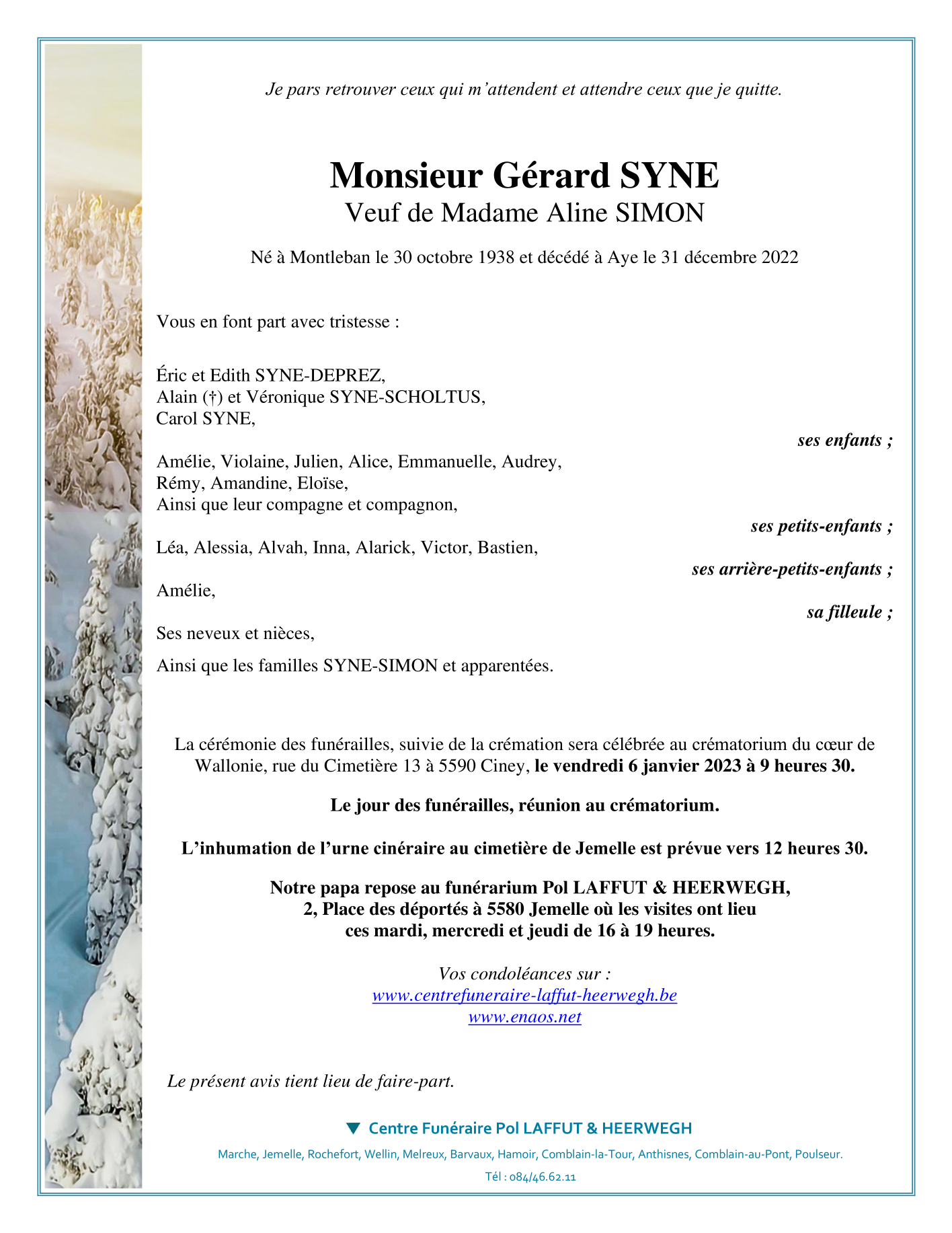 Décédé à Aye (6900) le samedi 31 décembre 2022 à l'âge de 84 ans