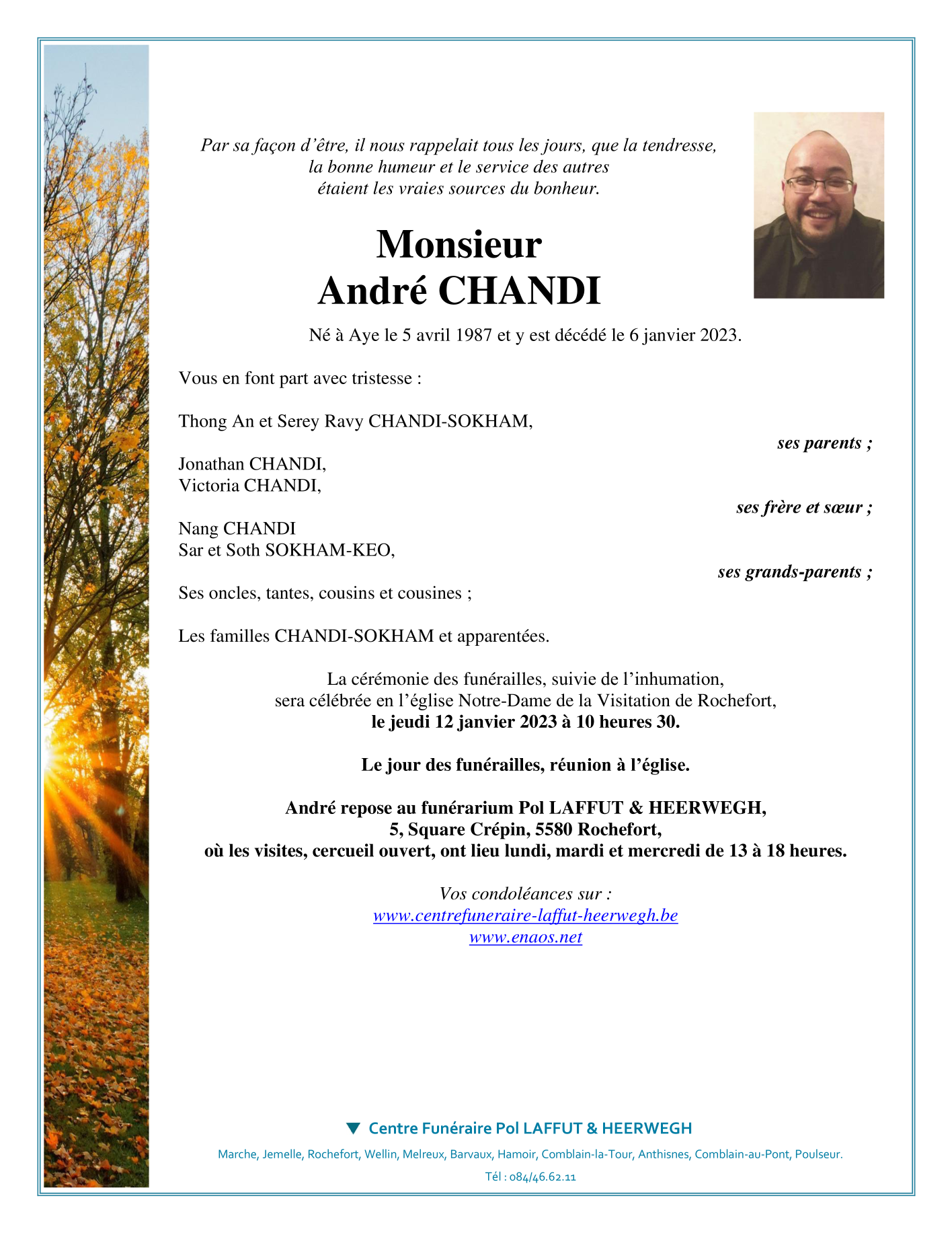 Décédé à Aye (6900) le vendredi 6 janvier 2023 à l'âge de 35 ans