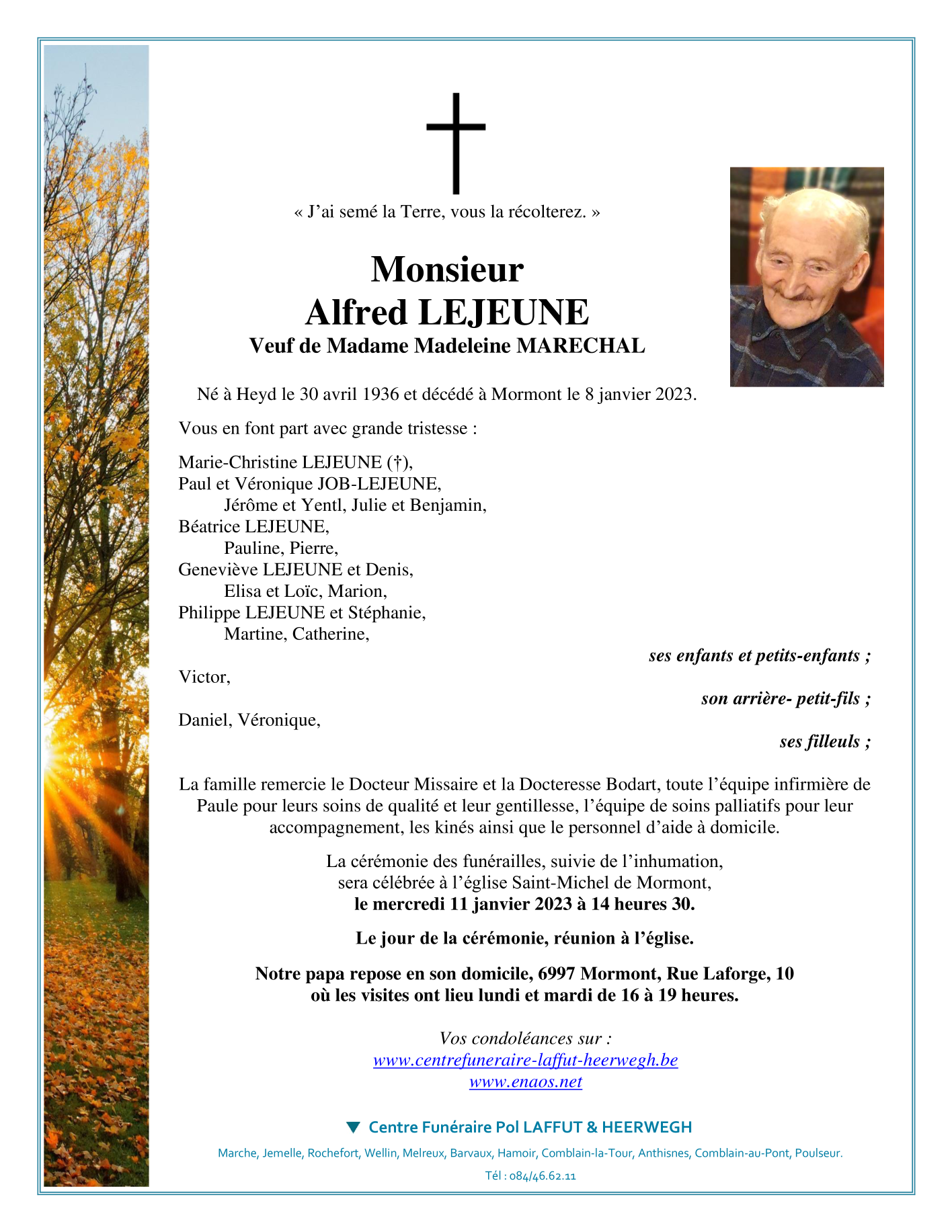 Décédé à Mormont (6997) le dimanche 8 janvier 2023 à l'âge de 86 ans