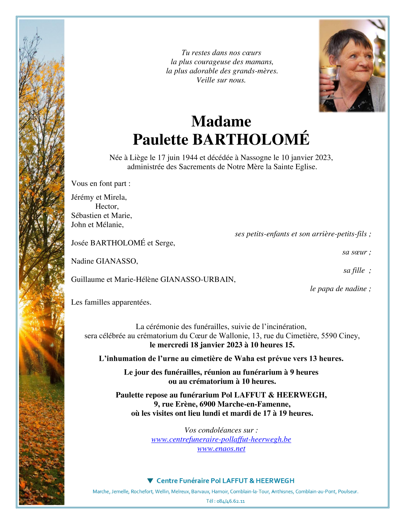 Décédée à Nassogne (6950) le mardi 10 janvier 2023 à l'âge de 78 ans