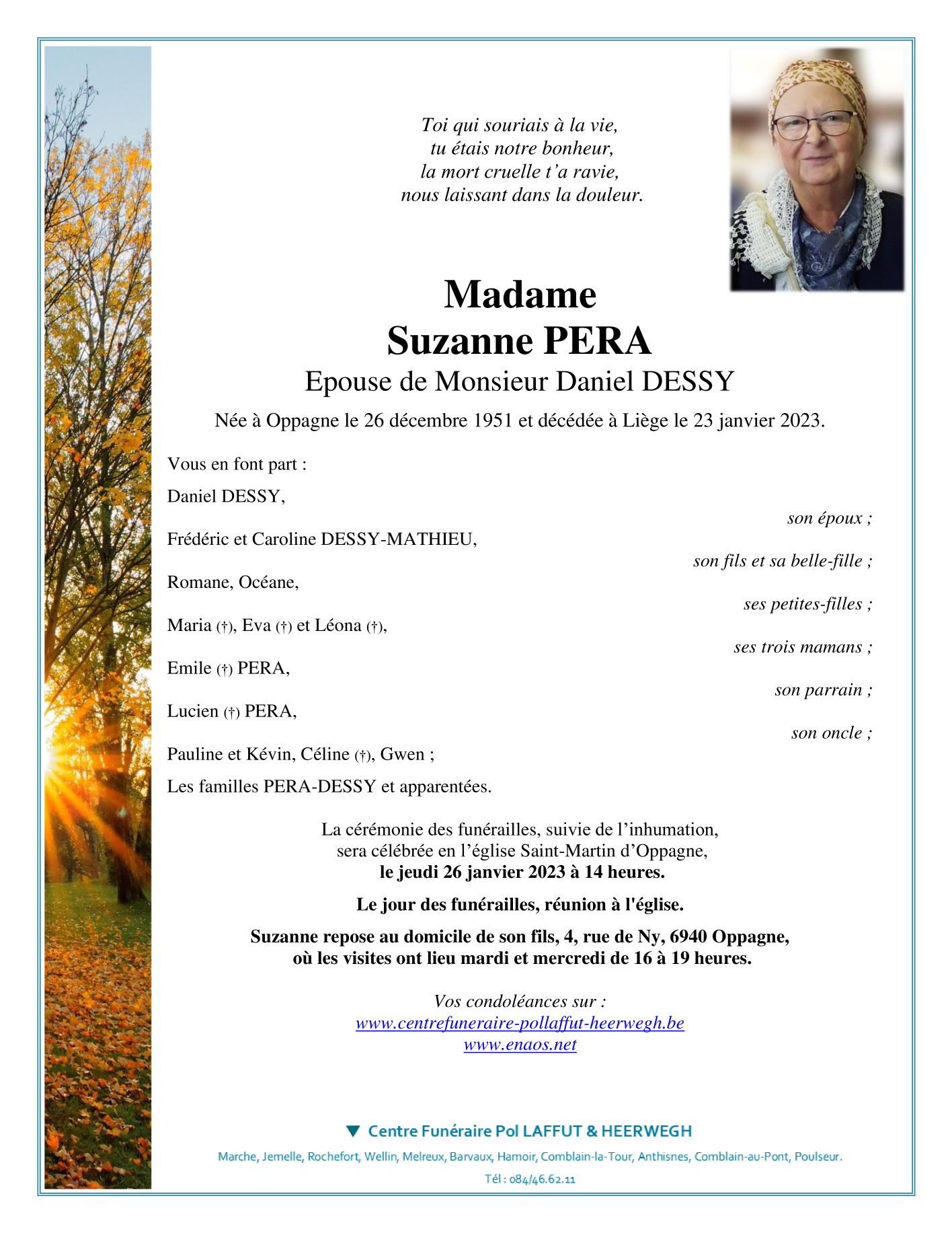 Décédée à Liège (4000) le lundi 23 janvier 2023 à l'âge de 71 ans
