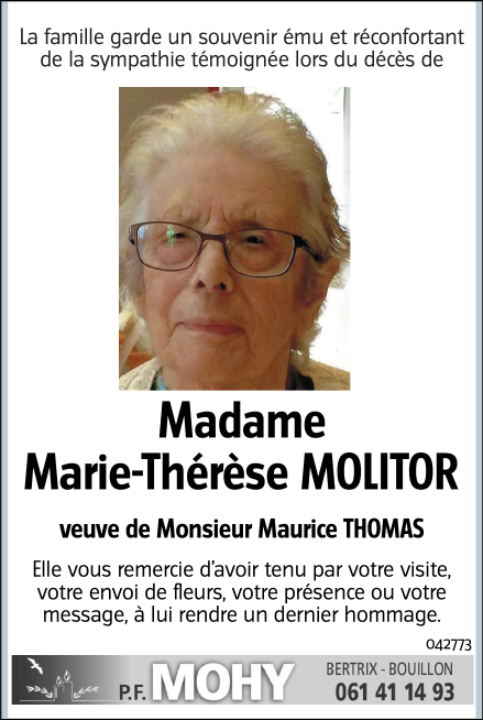 Fallecida en Bouillon (6830) el martes, 10 de enero de 2023 a la edad de 91 años