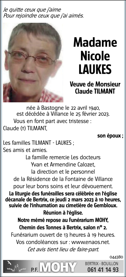 Décédée à Villance (6890) le samedi 25 février 2023 à l'âge de 82 ans