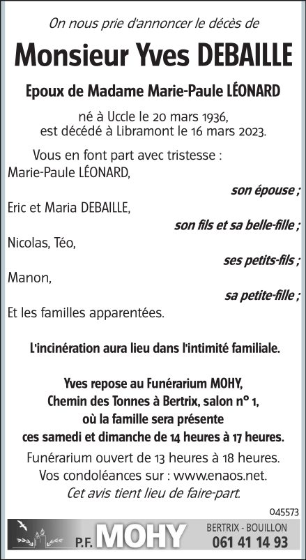 Overleden te Libramont (6800) op donderdag 16 maart 2023 op 86-jarige leeftijd