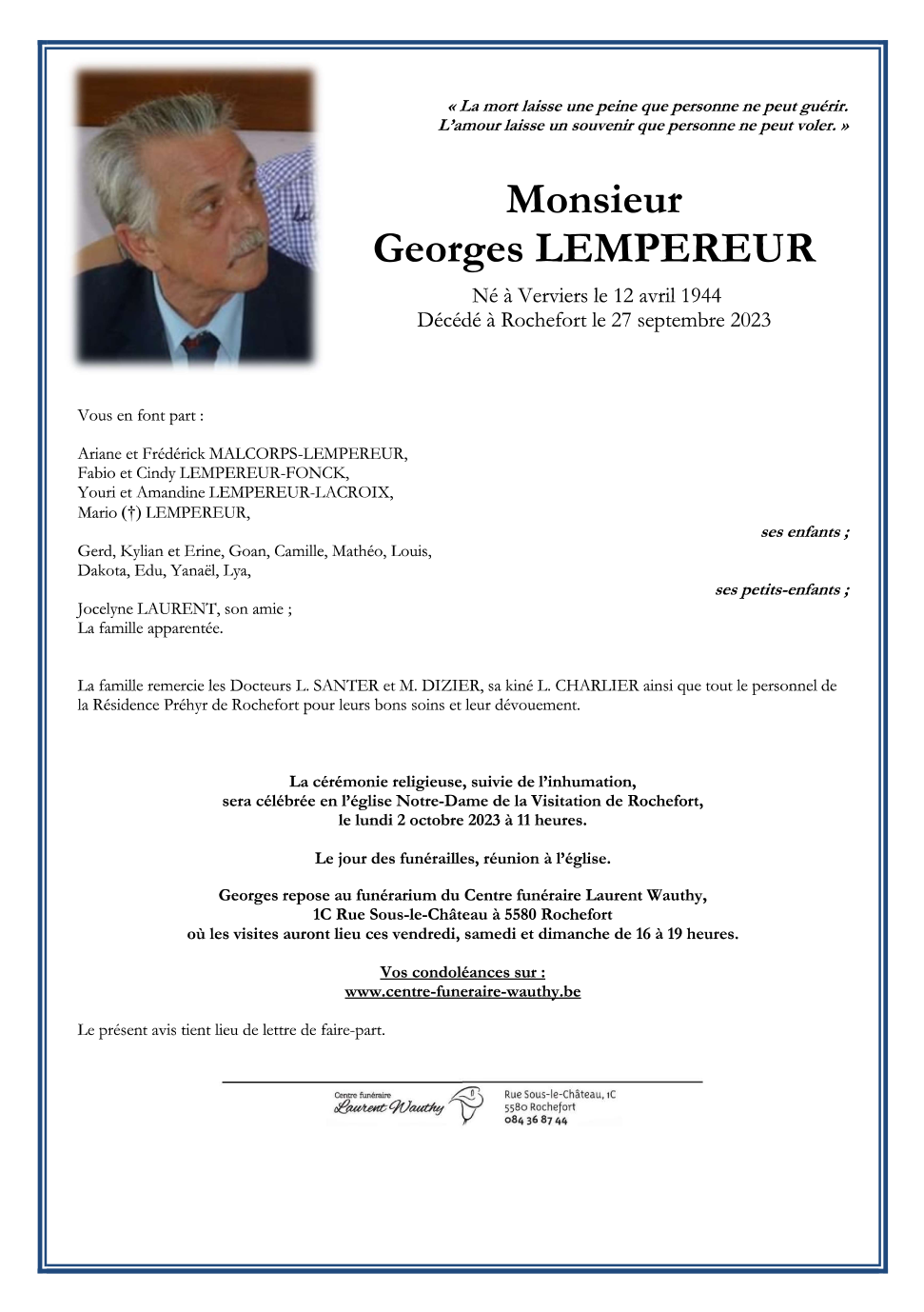 Décédé à Rochefort (5580) le mercredi 27 septembre 2023 à l'âge de 79 ans