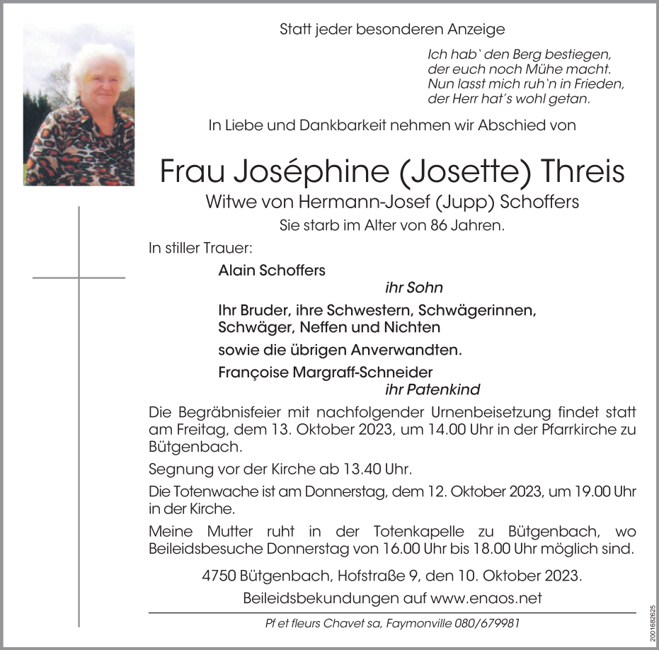Fallecida en Saint-Vith (4780) el miércoles, 11 de octubre de 2023 a la edad de 86 años